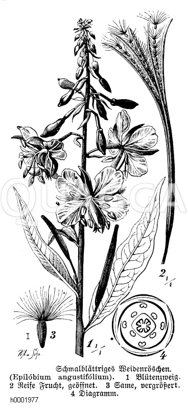 Schmalblättriges Weidenröschen: Zeichnung/Illustration/Holzstich – Epilobium angustifolium – –