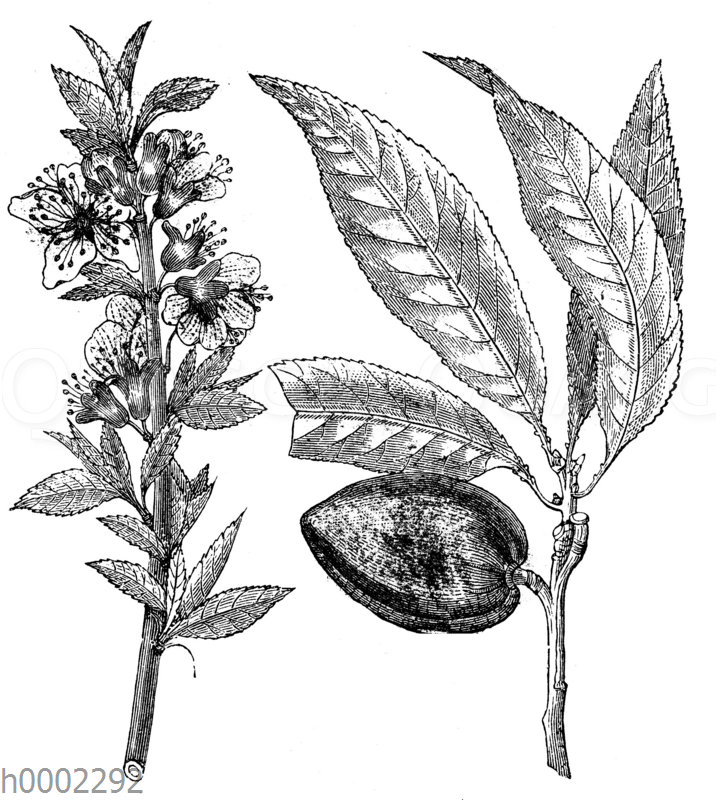 Mandelbaum: Blüte und Frucht: Zeichnung/Illustration/Holzstich – Prunus dulcis – –