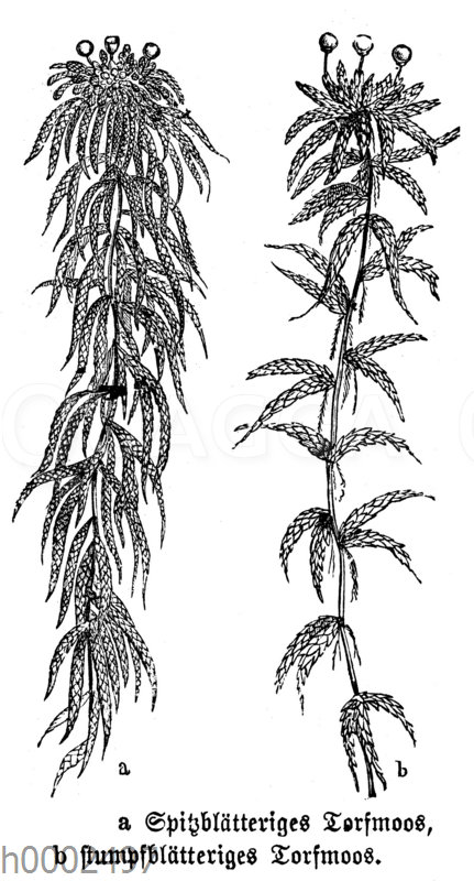 Spitzsblättriges Torfmoos, Stumpfblättriges Torfmoos: Zeichnung/Illustration/Holzstich – – –