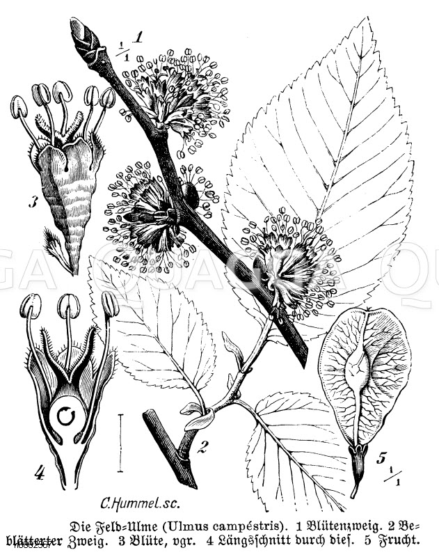 Feldulme, mit Blütenquerschnitt und Frucht: Zeichnung/Illustration/Holzstich – Ulmus campestris – Elm –