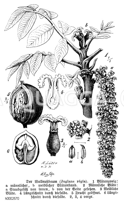 Walnussbaum: Zeichnung/Illustration/Holzstich – Juglans regia – Walnut tree –