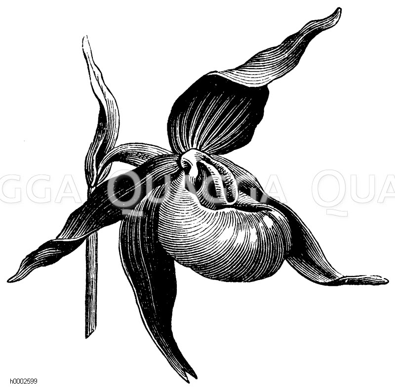 Frauenschuh: Blüte: Zeichnung/Illustration/Holzstich – Cypripedium calceolus – lady’s-slipper – sabot de Vénus