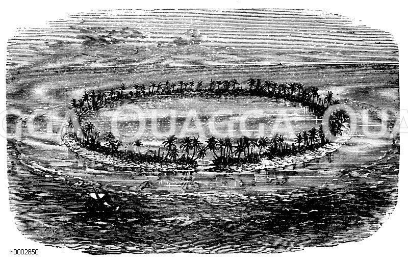 Korallen-Ringinsel: Tatakotoroa oder Clarke-Insel: Zeichnung/Illustration/Holzstich – – Coral Ring Island: Tatakotoroa or Clarke Island – Ile de l’Anneau de Corail: Tatakotoroa ou Ile Clarke