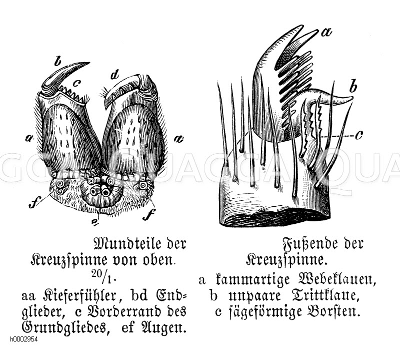 Kreuzspinne: Mundteile und Fußende: Zeichnung/Illustration/Holzstich – Araneus diadematus – European garden spider – Épeire diadème