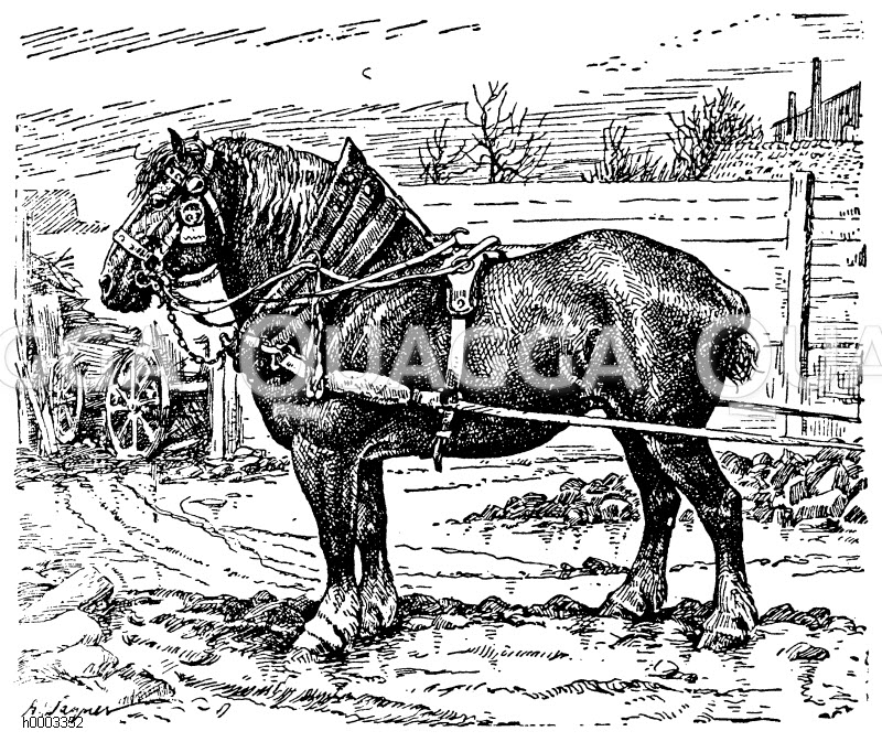 Pferd, Rasse: Niederrheinisches Pferd: Zeichnung/Illustration/Holzstich – – Horse, breed: Lower Rhine horse – Cheval, race: cheval du Bas-Rhin