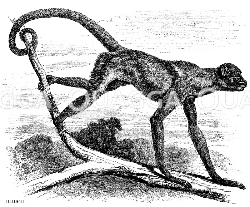 Muriki, Spinnenaffe, Miriki: Zeichnung/Illustration/Holzstich – Brachyteles hypoxanthus (Ateles hypoxanthus) – Muriqui, Woolly spider monkey, Brachyteles hypoxanthus – Éroide