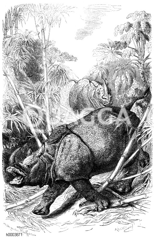 Indisches Nashorn: Zeichnung/Illustration/Holzstich – Rhinocerus indicus – Indian rhino –