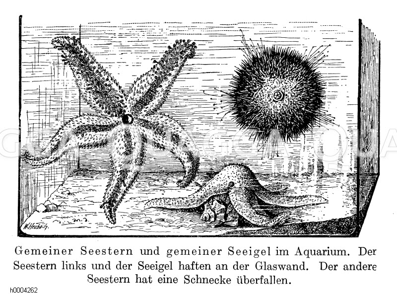 Seestern und Seeigel in einem Aquarium: Zeichnung/Illustration/Holzstich – Asterias rubens_ Echinus esculentus – –
