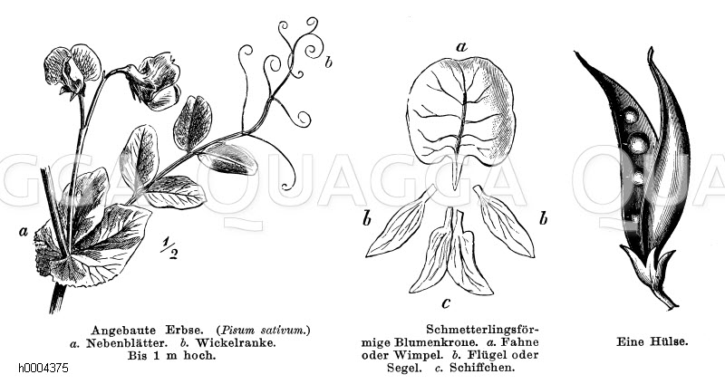 Erbse: Zeichnung/Illustration/Holzstich – Pisum sativum – Pea – Pois cultivé