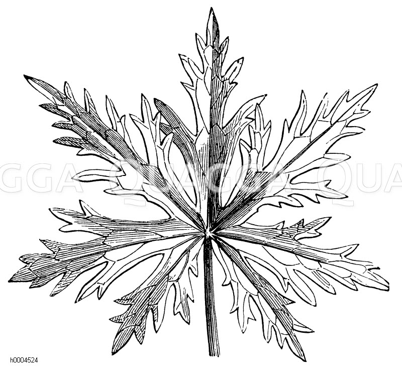 Scharfer Hahnenfuß: Handförmig geteiltes Blatt: Zeichnung/Illustration/Holzstich – Ranunculus acer – –