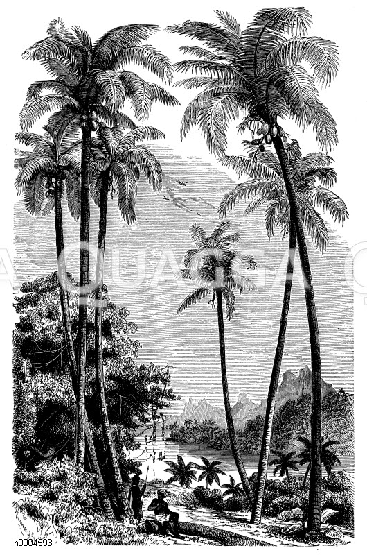 Kokospalme: Zeichnung/Illustration/Holzstich – Cocos nucifera – Coco –