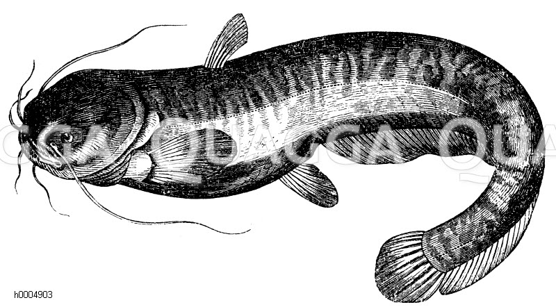Wels, Waller, Schaiden: Zeichnung/Illustration/Holzstich – Silurus glanis – European catfish or river catfish – Silure d’Europe ou poisson-chat de rivière