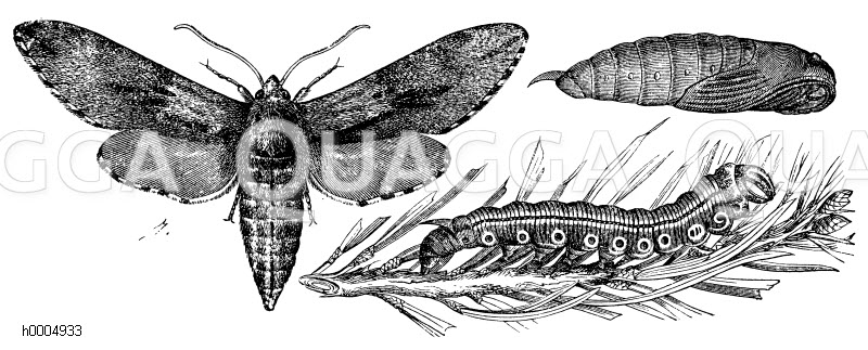 Kiefernschwärmer, Falter, Raupe und Puppe: Zeichnung/Illustration/Holzstich – Sphinx pinastri – –