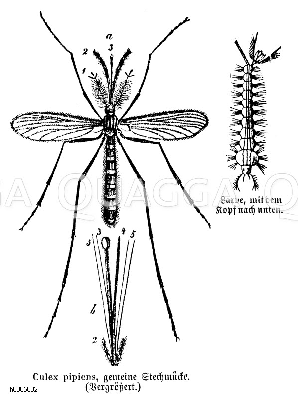 Stechmücke und Larve: Zeichnung/Illustration/Holzstich – – Mosquito and larvae – Moustique et larve