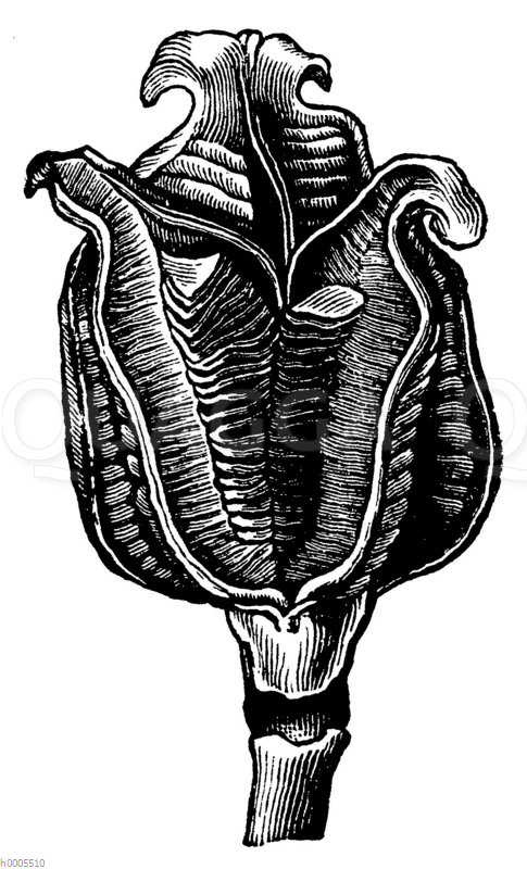 Tulpe: Zeichnung/Illustration/Holzstich – Tulipa gesneriana – Didier’s tulip or garden tulip, Cracked capsule – tulipe des jardins, Capsule craquelée