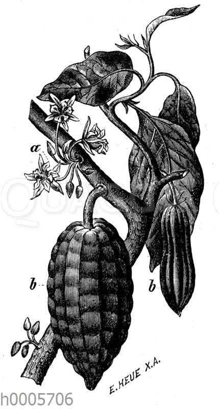 Botany; graphics; cocoa; Malvaceae – Mallow; Crop; crops; plant; plants; chocolate; stitch; xylograph; woodcut; botany; botanical illustration; useful; useful plant,