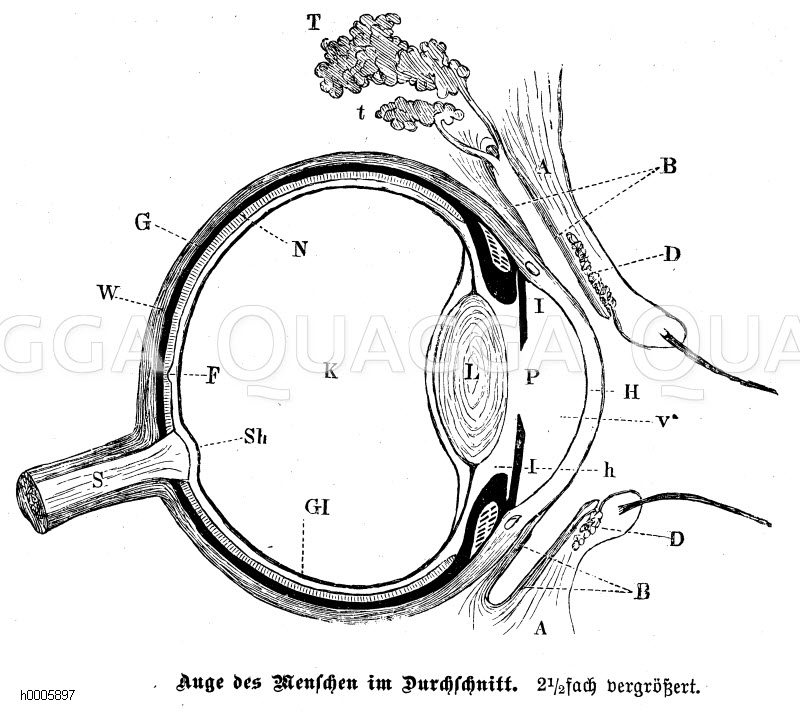 Mensch: Auge, Längsschnitt: Zeichnung/Illustration/Holzstich – – Human: eye, longitudinal section – Humain: œil, coupe longitudinale