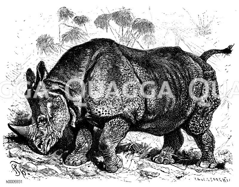 Indisches Nashorn: Zeichnung/Illustration/Holzstich – – Indian rhino –