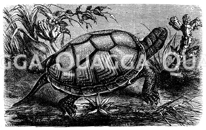 Europäische Flussschildkröte: Zeichnung/Illustration/Holzstich – – –