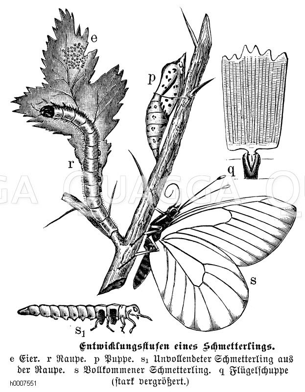 Schmetterling: Entwicklungsstufen: Zeichnung/Illustration/Holzstich – Lepidoptera – –