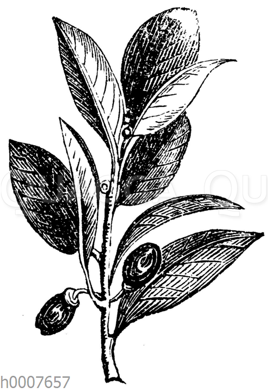 Zweig des Lorbeerbaums: Zeichnung/Illustration/Holzstich – Laurus nobilis – Laurel tree – laurier