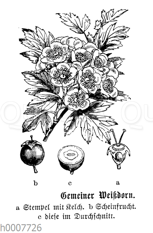 Weißdorn: Zeichnung/Illustration/Holzstich – Crataegus oxyacantha – Hawthorn –