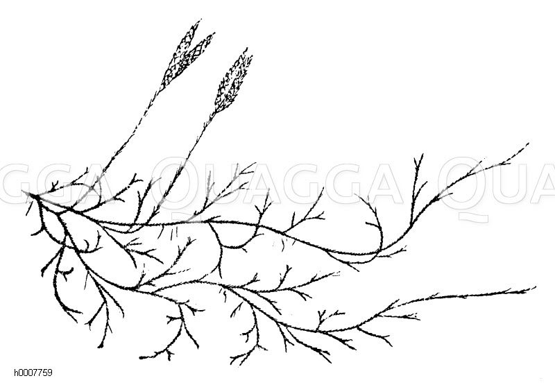 Kolbenbärlapp (Keulen-Bärlapp): Zeichnung/Illustration/Holzstich – Lycopodium clavatum – wolf’s-foot clubmoss, stag’s-horn clubmoss or groundpine –