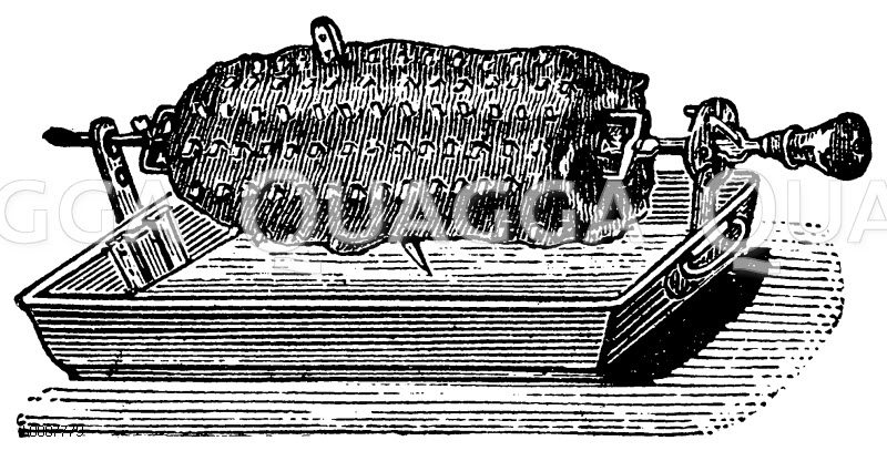 Spießbratpfanne: Zeichnung/Illustration/Holzstich – – –