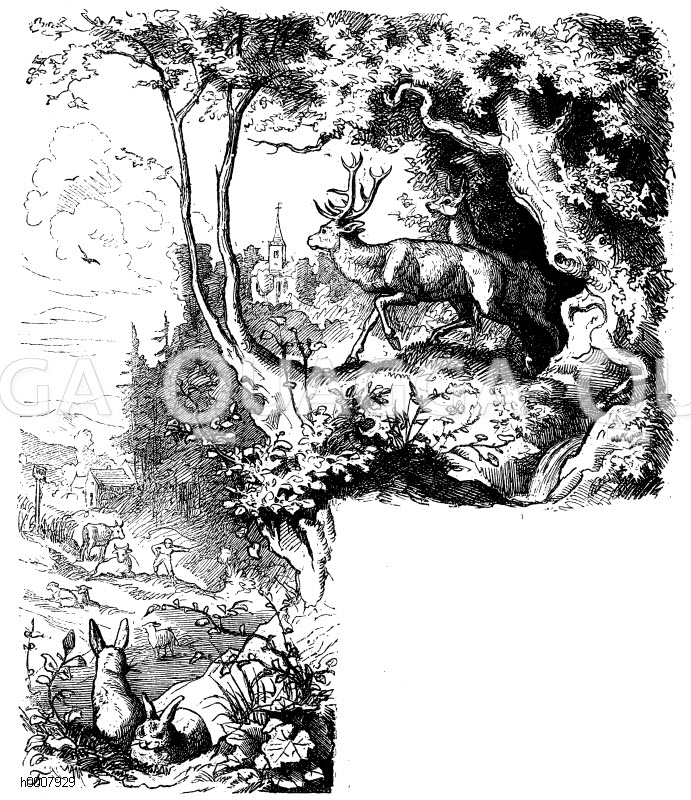 Noble deer; Field hare; Deer; Ungulate; Rodent; Rodents; Red deer; Vignette; Forest, Cerf élaphe ; Cerf rouge ; Ongulés ; Forêt ; Rongeur ; Lapin ; Lièvre ; Vignette