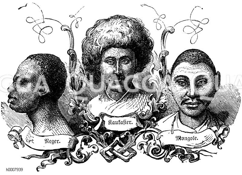 Afrikaner, Kaukasier, Mongole: Zeichnung/Illustration/Holzstich – – African, Caucasian, Mongolian – Africain, Caucasien, Mongol