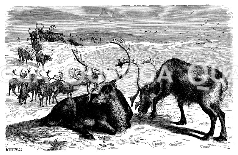 Rentiere: Zeichnung/Illustration/Holzstich – – Reindeers –