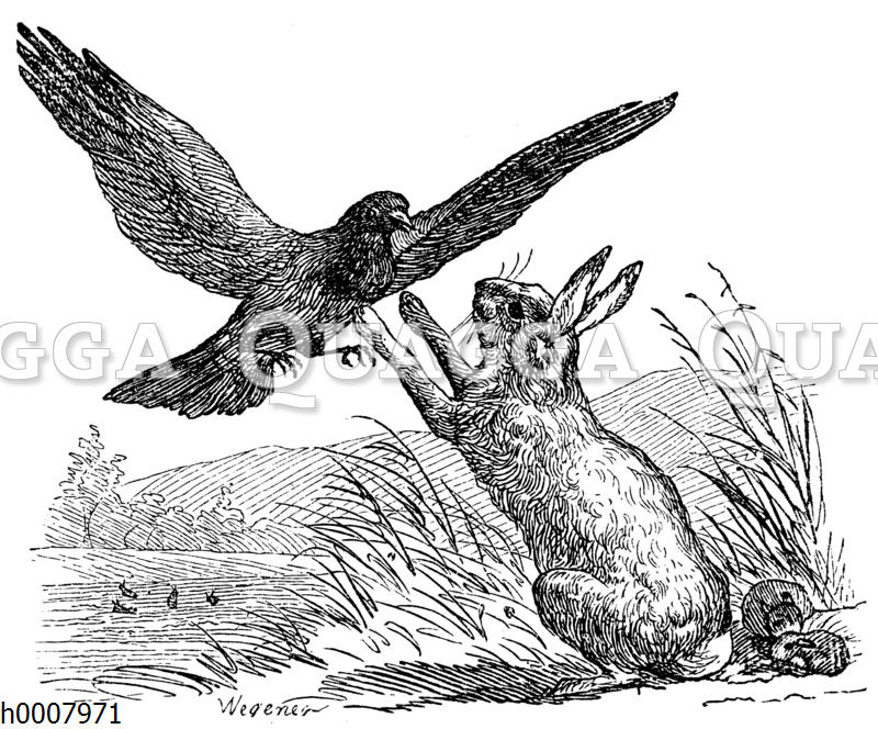 Häsin schützt ihre Jungen vor einem Raubvogel: Zeichnung/Illustration/Holzstich – – –