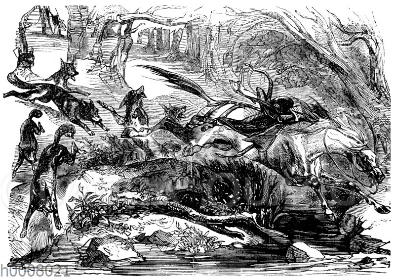 Wölfe, Wolfrudel, ein reiterloses, gesatteltes Pferd verfolgend: Zeichnung/Illustration/Holzstich – Canis lupus – –