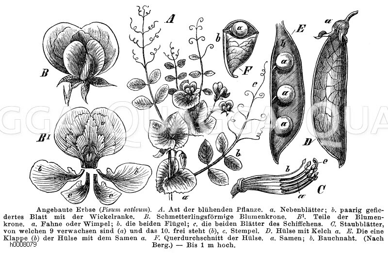 Erbse: Zeichnung/Illustration/Holzstich – Pisum sativum – Pea – Pois cultivé