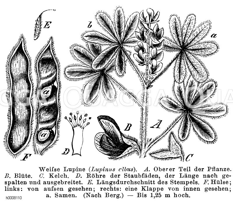 Weiße Lupine: Zeichnung/Illustration/Holzstich – Lupinus albus – white lupin or field lupine – Lupin blanc