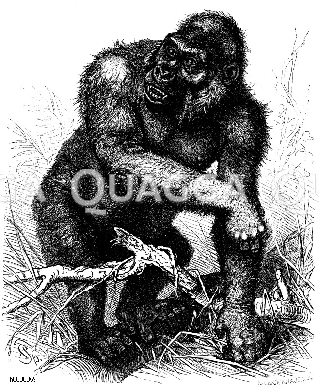Gorilla: Silberrücken, altes Männchen: Zeichnung/Illustration/Holzstich – Gorilla gorilla (Gorilla gina, Pythecus gorilla, Simia gorilla, Troglodytes gorilla, Anthropopithecus gorilla) – Gorilla: old male, silverback – Gorille: dos argenté