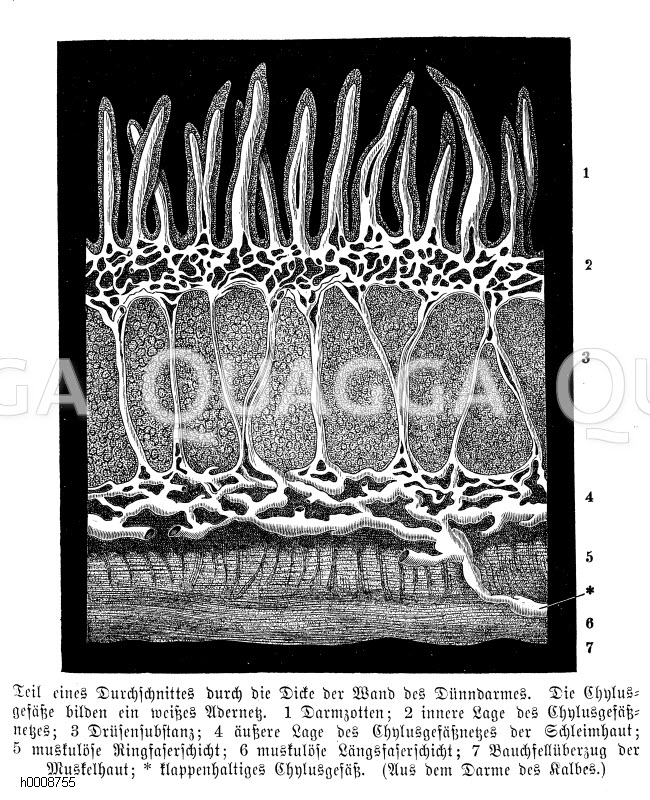 Dünndarm. Teil eines Durchschnittes durch die Dicke der Wand des Dünndarmes. Die Chylusgefäße bilden ein weißes Adernetz. 1) Darmzotten, 2) innere Lage des Chylusgefäßnetzes, 3) Drüsensubstanz, 4) äußere Lage des Chylusgefäßnetzes der Schleimhaut, 5) muskulöse Ringfaserschicht, 6) Längsfaserschicht, 7) Bauchfellüberzug der Muskelhaut, * klappenhaltiges Chylusgefäß. (Aus dem Darm des Kalbes): Zeichnung/Illustration/Holzstich – – –