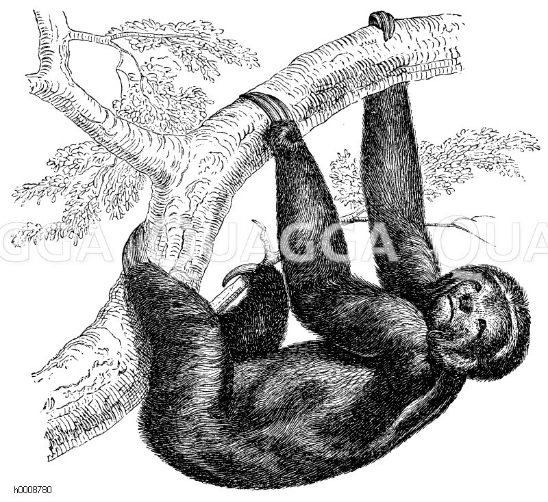 Ai, Dreizehenfaultier: Zeichnung/Illustration/Holzstich – Bradypus tridactylus – pale-throated sloth – Paresseux à trois doigts, Paresseux à gorge claire, Mouton paresseux ou Aï