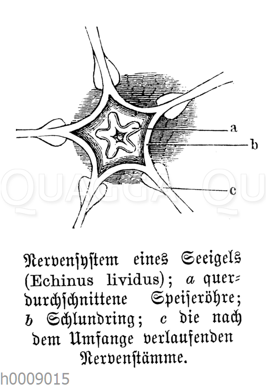Seeigel: Nervensystem. a) querdurchschnitt Speiseröhre_ b) Schlundring_ c) Nervenstämme