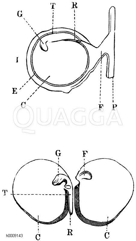 Erbse mit ihrer Schale durchschnitten: Zeichnung/Illustration/Holzstich – Pisum sativum – pea intersected with their shell. C) cotyledons, G) of the small leaves veiled stem bud, R) root, T) axis_ I) outer seed coat_ E) inner seed coat_ F) seed sources_ P) Piece of fruit (top)_ Pea spread apart, not in shell, F) small cave in which the stem bud G) was – Pois cultivé