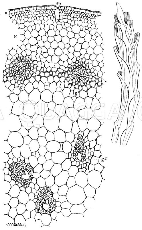 Links: Teil eines Querschnittes durch den Stengel von Tradescantia Selloi. o) Oberhaut mit einer Spaltöffnung (sp). R) Rinde, V) Verdickungsring mit den äußeren Gefäßbündeln. Rechts: Gefäßbündelverlauf der Schwertlilie auf dem Längsschnitt: Zeichnung/Illustration/Holzstich – – –