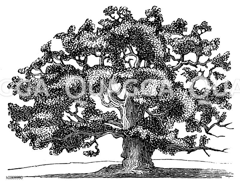 Tree; botany; trees; Fagaceae – Beech family; graphic; graphics; wood engraving; wood engravings; illustration; illustrations; plant; plants; random; line drawing; xylograph; woodcut; drawing; botanical; botanical illustration; historic; black and white; vintage,