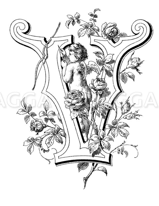 Buchstabe V, Schriftart: Amoretten: Zeichnung/Illustration/Holzstich – – Alphabetic character, letter V, cupid –
