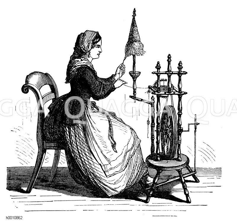 Spinnrad mit Spinnerin: Zeichnung/Illustration/Holzstich – – –