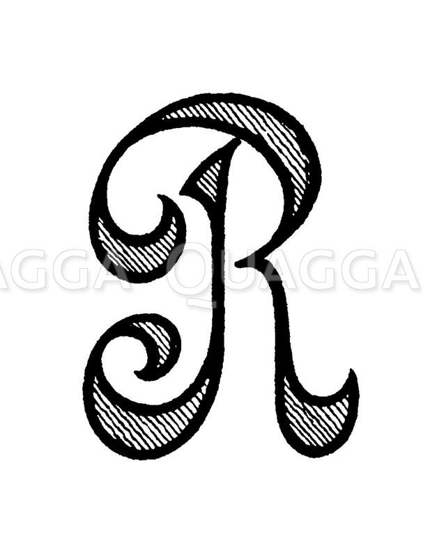 Buchstabe R, Verzierte Ronde: Zeichnung/Illustration/Holzstich – – –