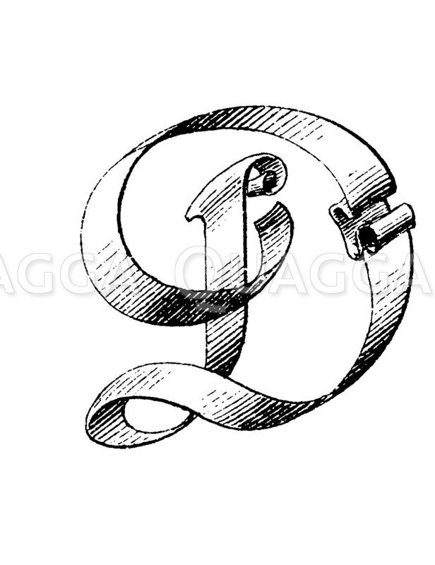 Buchstabe D, Bandschrift: Zeichnung/Illustration/Holzstich – – ribbon alphabet, letter D –