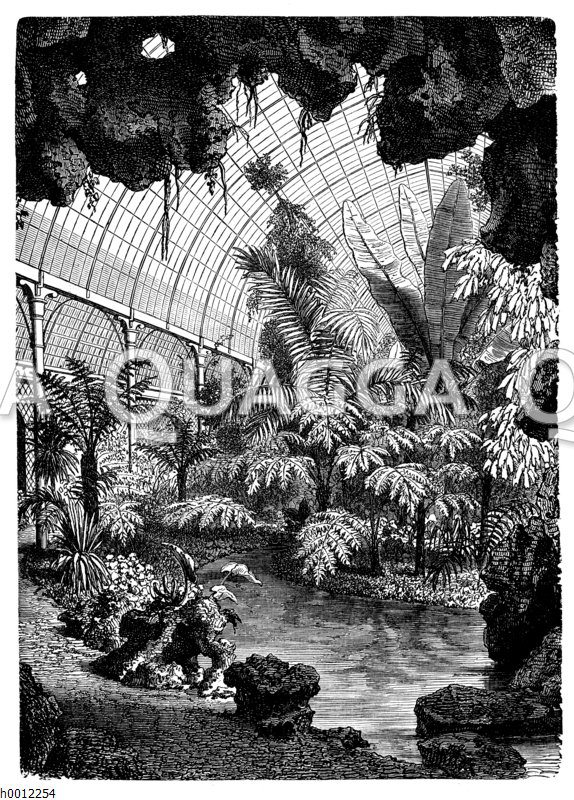 Inneres eines Gewächshauses: Zeichnung/Illustration/Holzstich – – Interior of a greenhouse – Interieur d’une serre