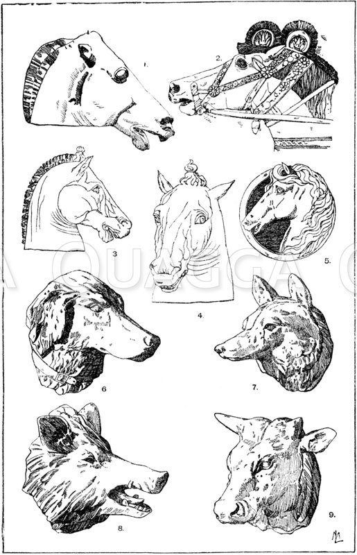 Verschiedene ornamentale Tierköpfe: Zeichnung/Illustration/Holzstich – – –