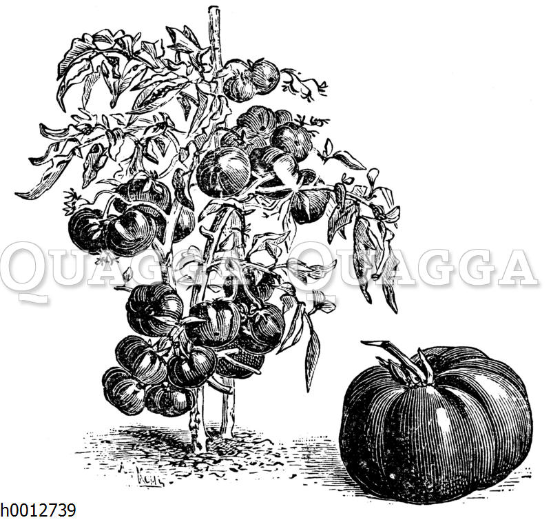 Tomate, rechts: stark verkleinerte Frucht: Zeichnung/Illustration/Holzstich – – –