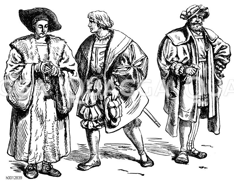 Deutsche Renaissancetracht (1500-1550), links: Bürger (Anfang des Jahrhunderts), mitte: Stutzer (seit 1520), rechts: Bürger (seit 1520): Zeichnung/Illustration/Holzstich – – German Renaissance Costume (1500-1550), left: Citizen (beginning of the century), middle: Stutzer (since 1520), right: Citizen (since 1520) – Costume de la Renaissance allemande (1500-1550), à gauche: Citoyen (début du siècle), milieu: Stutzer (depuis 1520), à droite: Citoyen (depuis 1520)